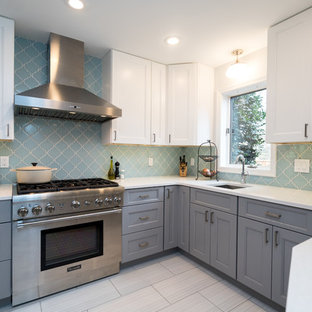 Space by martha o'hara interiors,swan architecture, and great neighborhood homes,. A vintage dove grey kitchen with a statement navy kitchen island and white sone countertops plus glass pendant laps. Blue kitchen cabinets with with gray quartz countertops featuring ivory and white geometric backsplash tile s in a contemporary kitchen design. Maintaining a uniform color for both the backsplash and kitchen countertop shouldn't hinder your. Transitional beach style kitchen with gray gold detailed hood white kitchen cabinets and grayish blue herringbone backsplash.